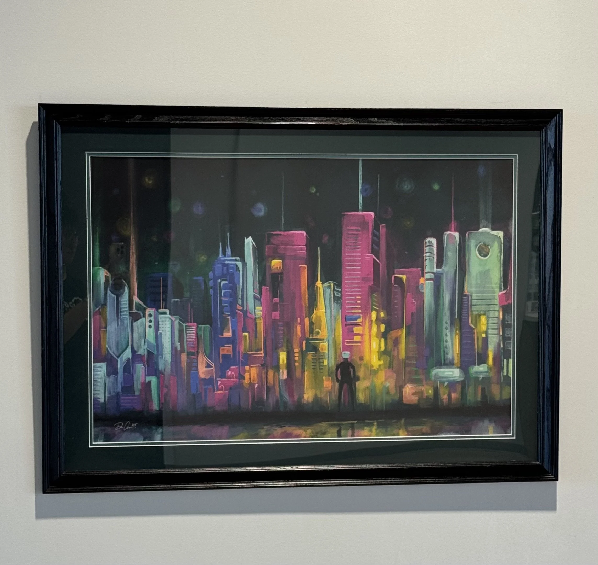 Looking back on “Ville De Néon” I knew I wanted to create something big and something very loud and that was about it. As I experimented with colors and shapes to start the idea and image of an electric neon cityscape started to take shape. As I worked, I strived to make some colors so bright they almost would look like they were actually glowing. I wanted an awe-inspiring sight that was more about the color than any actual buildings. When I was nearing completion, I couldn’t help but feel like it was missing something, so next came the human silhouette. What good is an impressive city of neon with nobody to be in awe by it. As I shaped, outlined, and colored it all was finally coming together. A city so vibrant and seemingly bustling, but a city also quite undefined. I had a hard time deciding when it was finished but once I did, I knew it needed a name. City of Neon is what I landed on, but it just didn’t quite seem to match the grandeur. I’ve always thought French was the most beautiful language, (even if my grades studying it in high school don’t paint the same picture) so I translated the name and knew instantly it was the title it actually deserved.