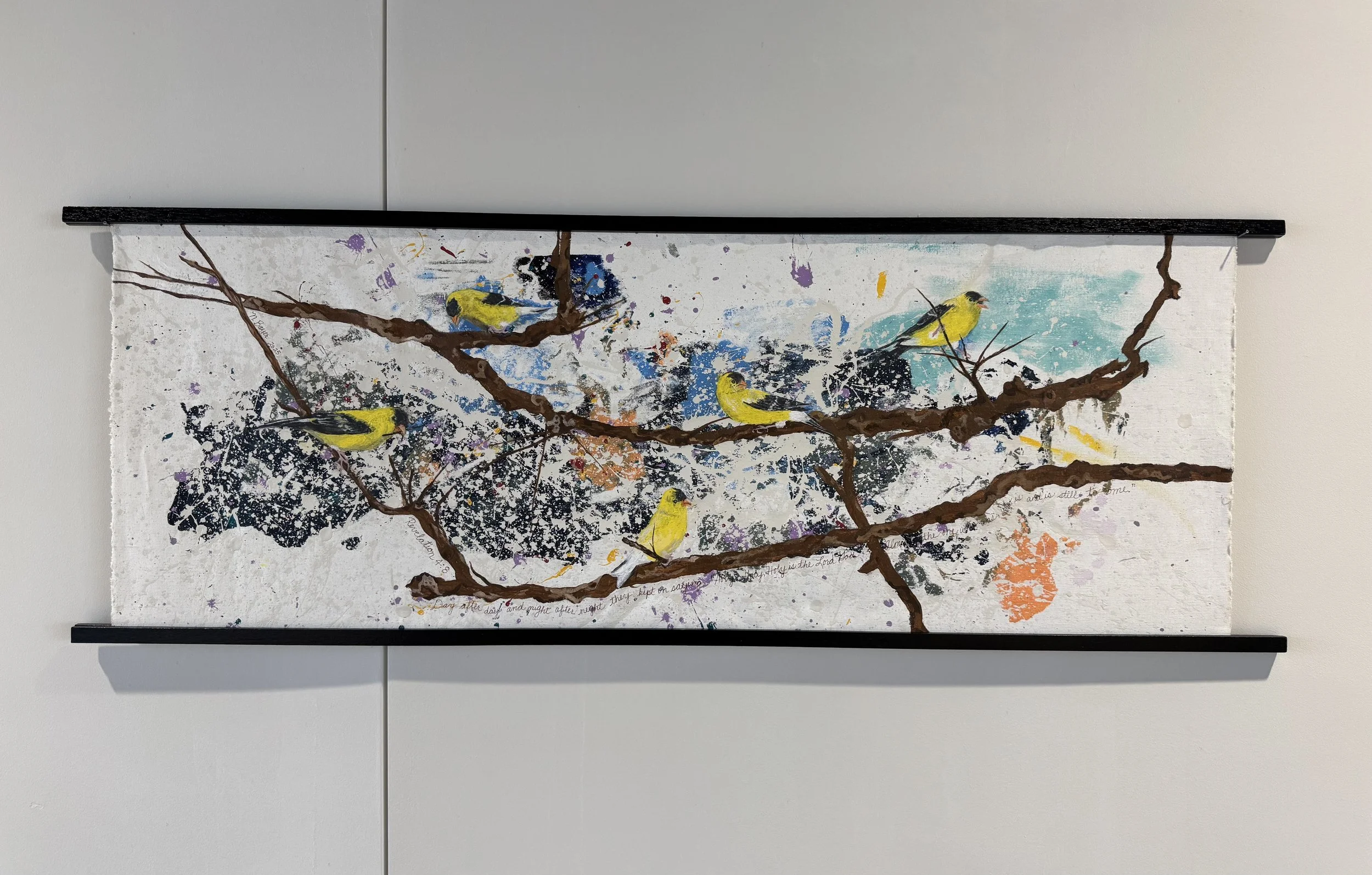 My family watches and feeds birds at our house and we have many feathered visitors year around. I pulled out the splattered canvas and could see that a group of goldfinches with their bright yellow plumage could possibly show up against the splattered colors.