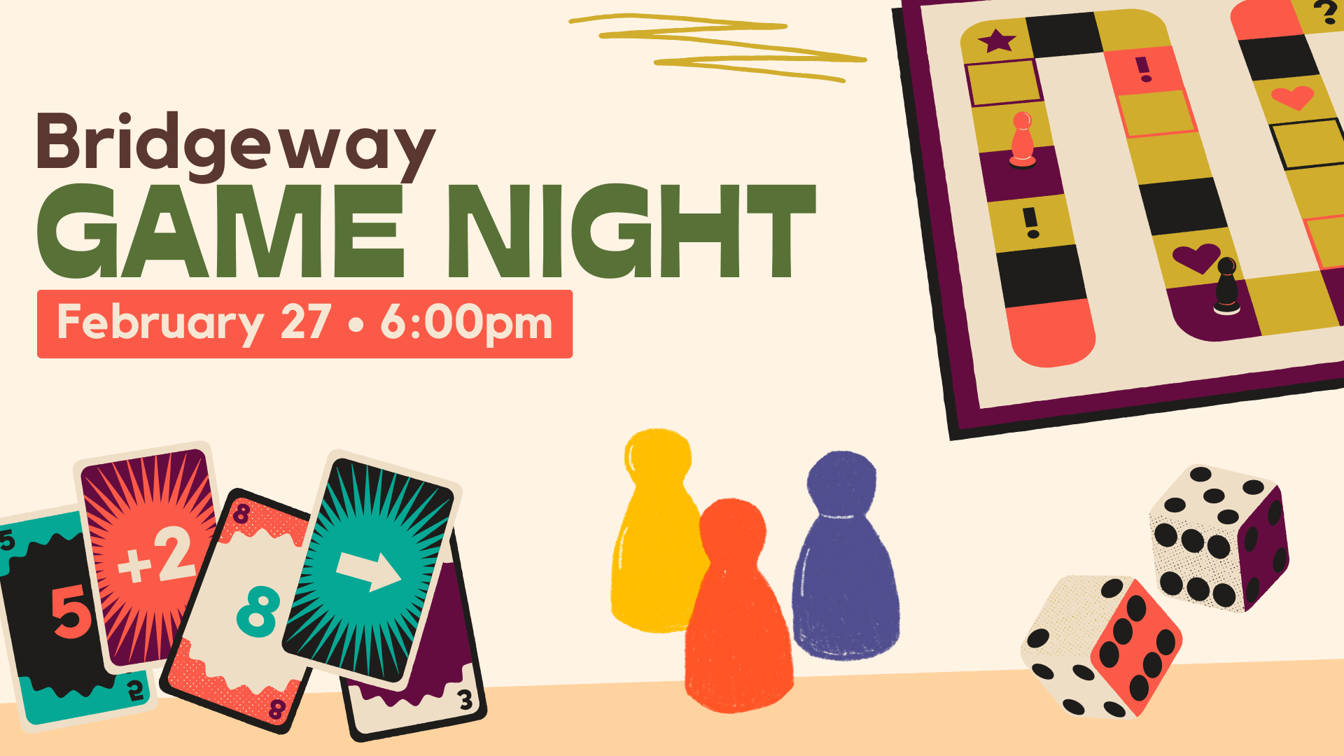 Do you enjoy a competitive game of Catan? Or maybe a few a fast paced rounds of Dutch Blitz? Join us February 27 at 6pm for a game night at Bridgeway! We’ll have some games to choose from, but we encourage you to bring your own and make some friends. Hope to see you there!
